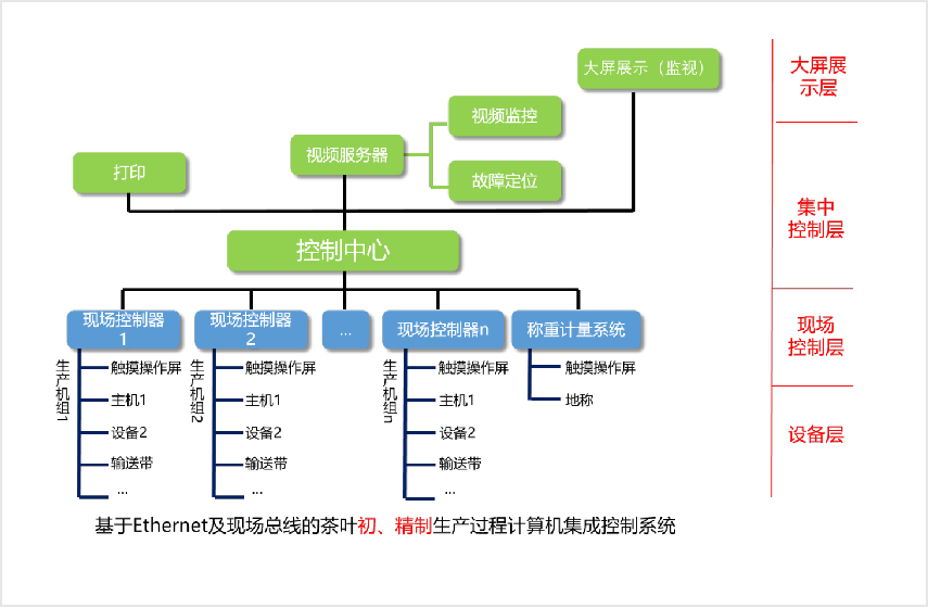 控制系統采用網絡技術及現場總線技術,分為大屏展示(監視)層、集中控制層、現場控制層和設備層共四級。系統通過網絡,將現場控制單元進行互聯,將所有數據集中到總控計算機上,從而形成對整條生產線的控制以及生產參數與報表的匯總,并把相關的展示信息和畫面監控信息投送大屏展示層,具備傳輸信號容量大、實時性強的特點。