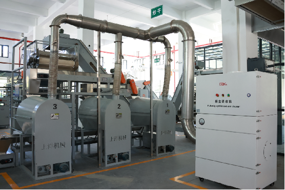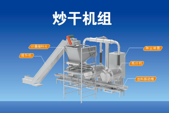 機組組成:本機組由瓶式炒干機、計量儲料斗、提升機、出料振動槽、除塵裝置、機組集成控制系統組成。